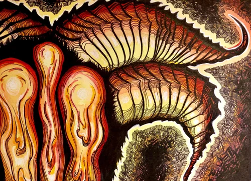 Boar-spirit, created October 2018 for Gods and Monsters gallery show. 11x17, marker, ink, and gold paint.